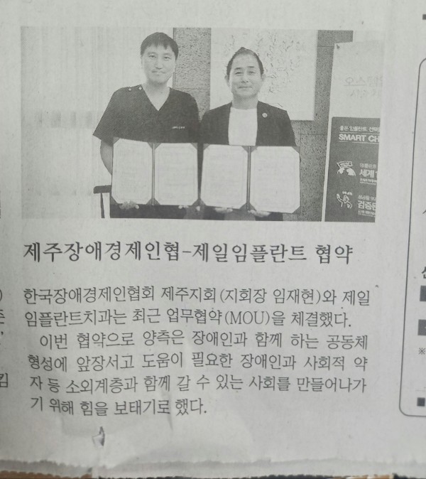 보도자료 한국장애경제인협회 제주지회 지회장 (임재현) 과 제일임플란트치과와 업무협약(MOU) 체결(소통투데이 ,한라일보) 관리자 0 2025-10-20 16:16:29 247 http://www.jejusotong.today/news/articleView.html?idxno=40183소통투데이, 한라일보에 기재된 보도자료입니다 2025 장애인CEO 경영혁신 연수 경쟁력강화 제주지회 워크샵 (제주소통투데이,한라일보 ) 한국장애경제인협회 제주지회 김재현이사님 하나병원 이사장 취임 축하 목록보기 지회소개 인사말 지회개요 지회연혁 조직도 오시는길 주요사업 판로지원및공동구매 장애경제인위상제고 장애기업창업촉진 정책개발/홍보 경영애로상담 소액수의계약 추천제도 참여안내 후원안내 회원안내 커뮤니티 1:1상담 알림마당 공지사항 협회소식 보도자료 지회갤러리 자료실 신청서 장애인기업법 기타